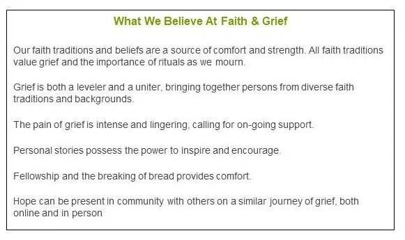 Founded in 2007 by two Presbyterian ministers in Dallas, TX, Faith & Grief provides opportunities for comfort and hope to those who have experienced the death of a loved one.