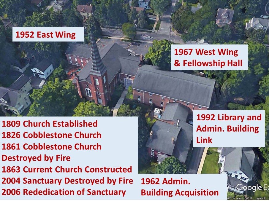 Renovations include construction of a new Sunday School addition, creation of the rear parking lot, installation of vestibule coat racks, and illumination of the stained glass windows. Membership is 423.